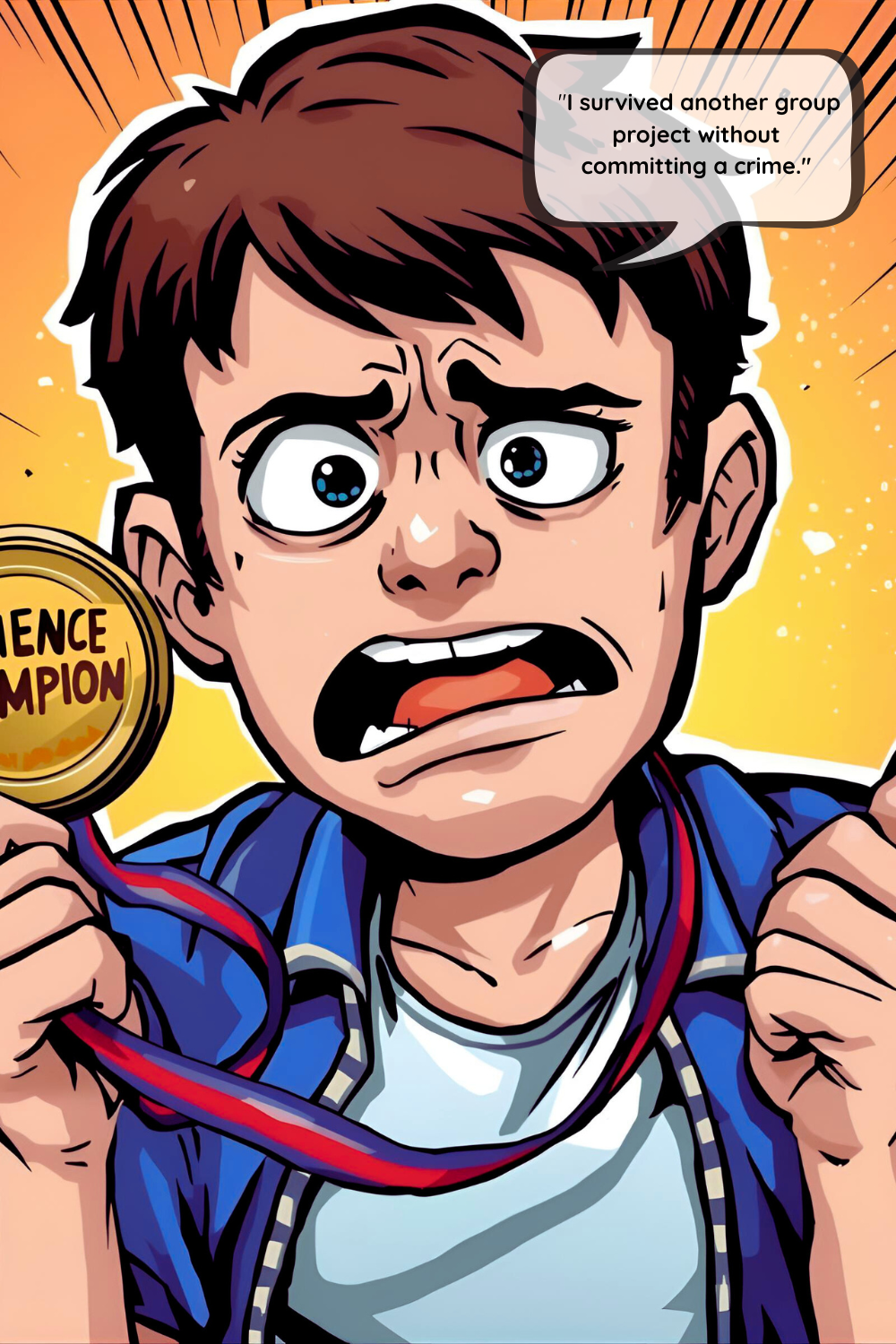 Group projects: the ultimate test of patience, diplomacy, and not flipping a desk. This comic-style poster hilariously captures the silent struggle of every teen who’s ever done 99% of the work while pretending everything’s fine.